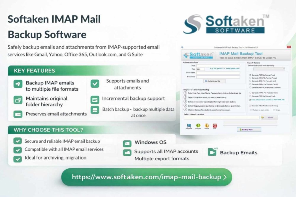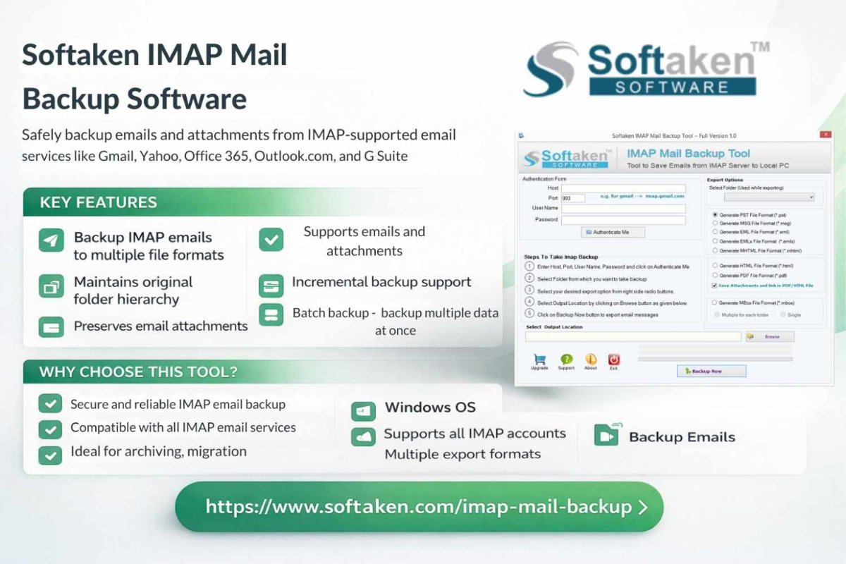 Backing up IMAP emails is a smart way to preserve essential communications on your computer. One easy way is to utilise the Softaken IMAP Email Backup Tool. This tool lets anyone connect to any IMAP email account, such Gmail, Yahoo, Office 365, or another webmail service, and download the emails straight to their computer. It can store mailbox data in a number of formats, such as PST, EML, MSG, MBOX, and PDF. This makes it easy to open the backup in other email systems. The software saves all the information about the email while it is backing up. It also lets you back up only certain folders and works with multiple versions of Windows. -